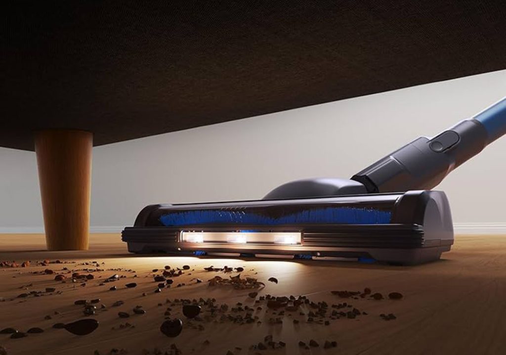 Greenote Pionowy Odkurzacz Bezprzewodowy jest wyposażony w dyszę podłogową z wbudowanym oświetleniem LED. Dzięki temu, nawet w słabiej oświetlonych miejscach, takich jak przestrzeń pod kanapą czy łóżkiem, użytkownik będzie w stanie dokładnie zobaczyć wszystkie zanieczyszczenia. Funkcja ta znacząco poprawia efektywność sprzątania, zwłaszcza w trudno dostępnych miejscach, gdzie tradycyjne odkurzacze mogą nie być wystarczająco skuteczne.